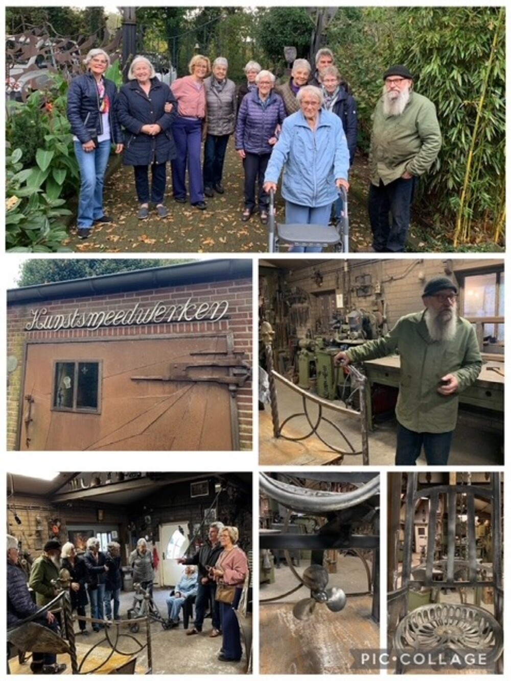 Ongelooflijk wat die man allemaal kan maken van ijzer en oude voorwerpen. Het meest nieuwsgierig waren we natuurlijk naar het kunstwerk wat hij voor ons dorp aan het maken is. Eerst kregen we een stukje geschiedenis over ons mooie dorp en daarna toonde hij het kunstwerk wat hij aan het maken is.